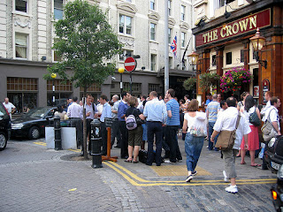 Monmouth Street / Seven Dials /Neal's Yard: recently repaved to alter hierarchy of cars to pedestrians. People often pass the time there, including sitting in effectively the middle of a roundabout, often stood outside drinking. One of the few areas in London where benches are actively brought onto the pavements by shop owners.